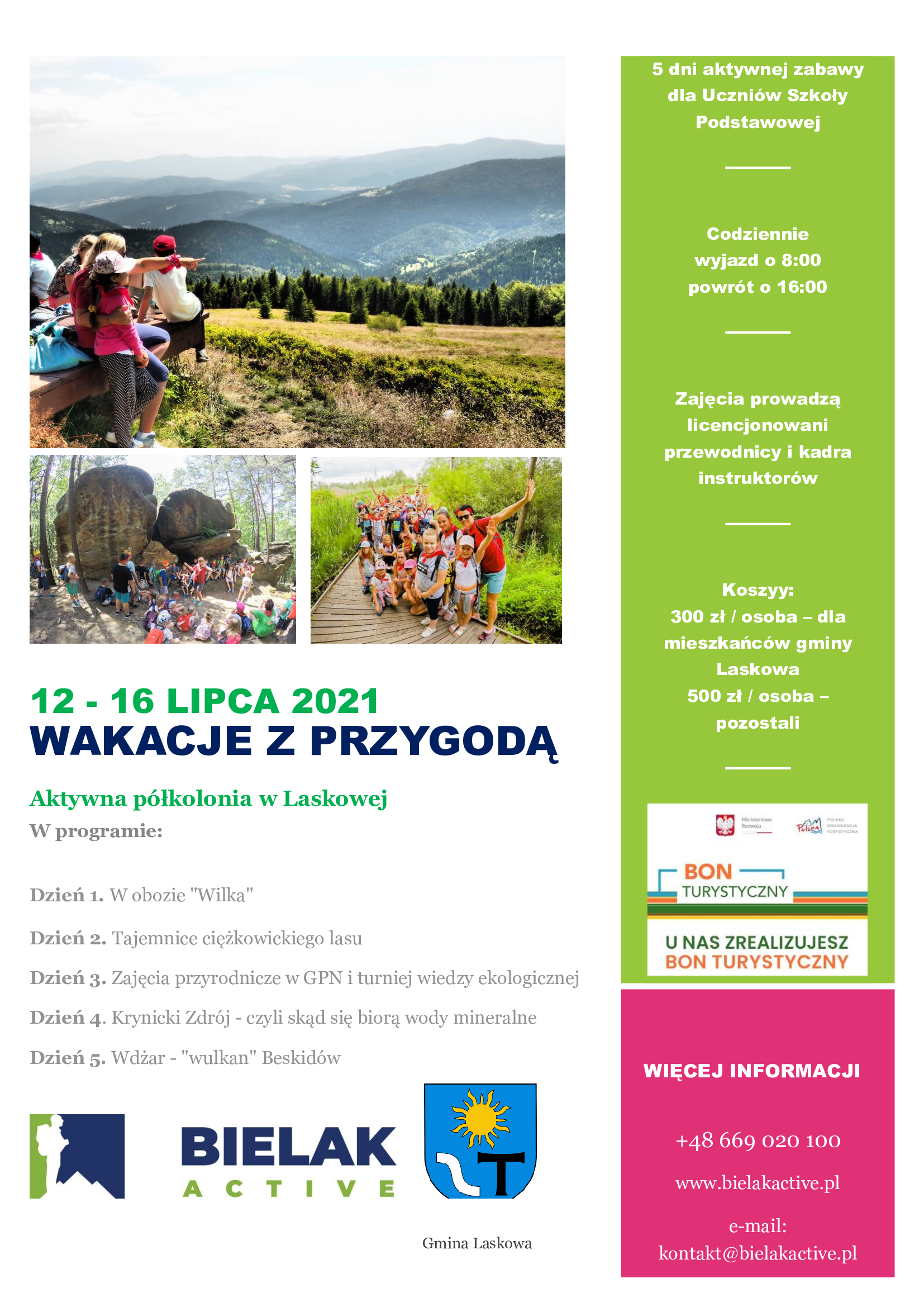 Zapraszamy dzieci i młodzież w wieku szkolnym: uczniowie klasy 1-8 Szkoły Podstawowej. Codziennie spotykamy się w centrum Laskowej o godzinie 8:00 wsiadamy do autokaru i odwiedzamy bliższą lub dalszą okolicę. Powrót planujemy około godziny 16:00