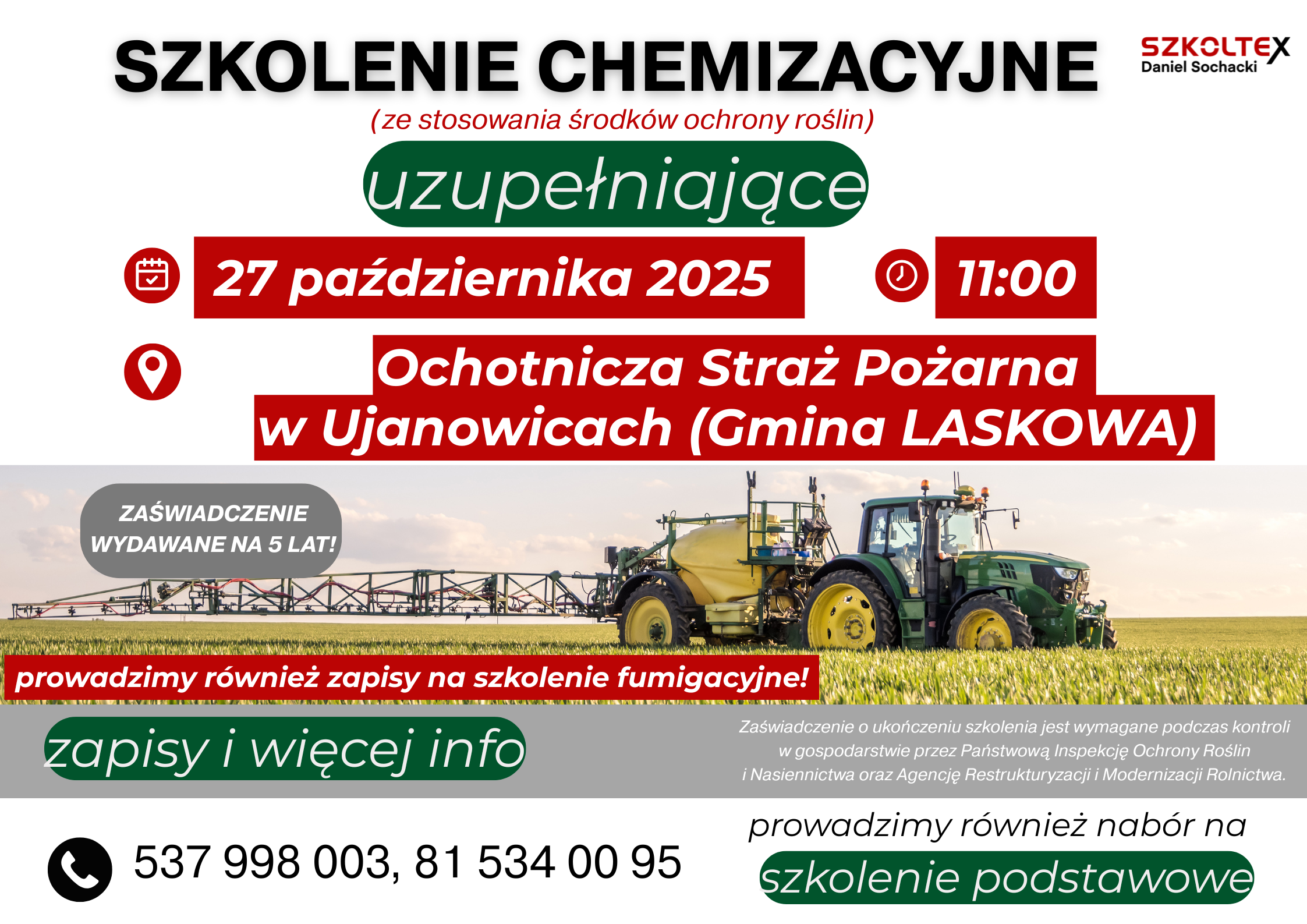 Szkolenie chemizacyjne Informacje w załączniku szkolenie.png Autor: Urząd Gminy Laskowa Data publikacji: 2025-10-10