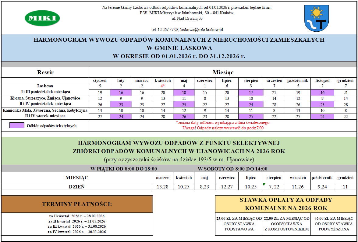 Urząd Gminy Laskowa informuje, że od 1 stycznia 2026 stawki za odpady komunalne będą wynosić: