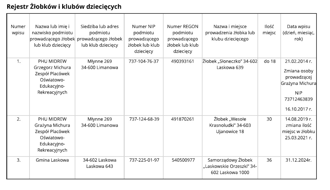 poz. 1447 z późn. zm.) i wymaga wpisu do rejestru żłobków i klubów dziecięcych. Rejestr żłobków i klubów dziecięcych prowadzących działalność na terenie Gminy Laskowa prowadzi Wójt Gminy Laskowa. Wójt Gminy dokonuje wpisu do rejestru na podstawie pisemnego wniosku o wpis do rejestru, złożonego przez podmiot zamierzający prowadzić żłobek lub klub dziecięcy. Wpis do rejestru podlega opłacie, która stanowi dochód własny Gminy Laskowa.