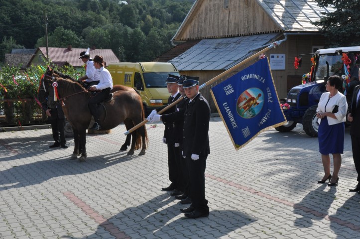 W trakcie Mszy Świętej nastąpiło uroczyste poświęcenie wieńców dożynkowych przygotowanych przez wszystkie sołectwa Gminy Laskowa. Mszy Świętej barwny korowód dożynkowy prowadzony przez Orkiestrę Dętą z Krosnej udał się na plac dożynkowy – stadion AKS w Ujanowicach, gdzie Starostowie Dożynek Pani Małgorzata Gołąb i Pan Grzegorz Grzegorzek obdarowali Wójta Gminy Laskowa Panią Stanisławę Niebylską chlebem i koszem owoców - symbolami tegorocznych plonów.